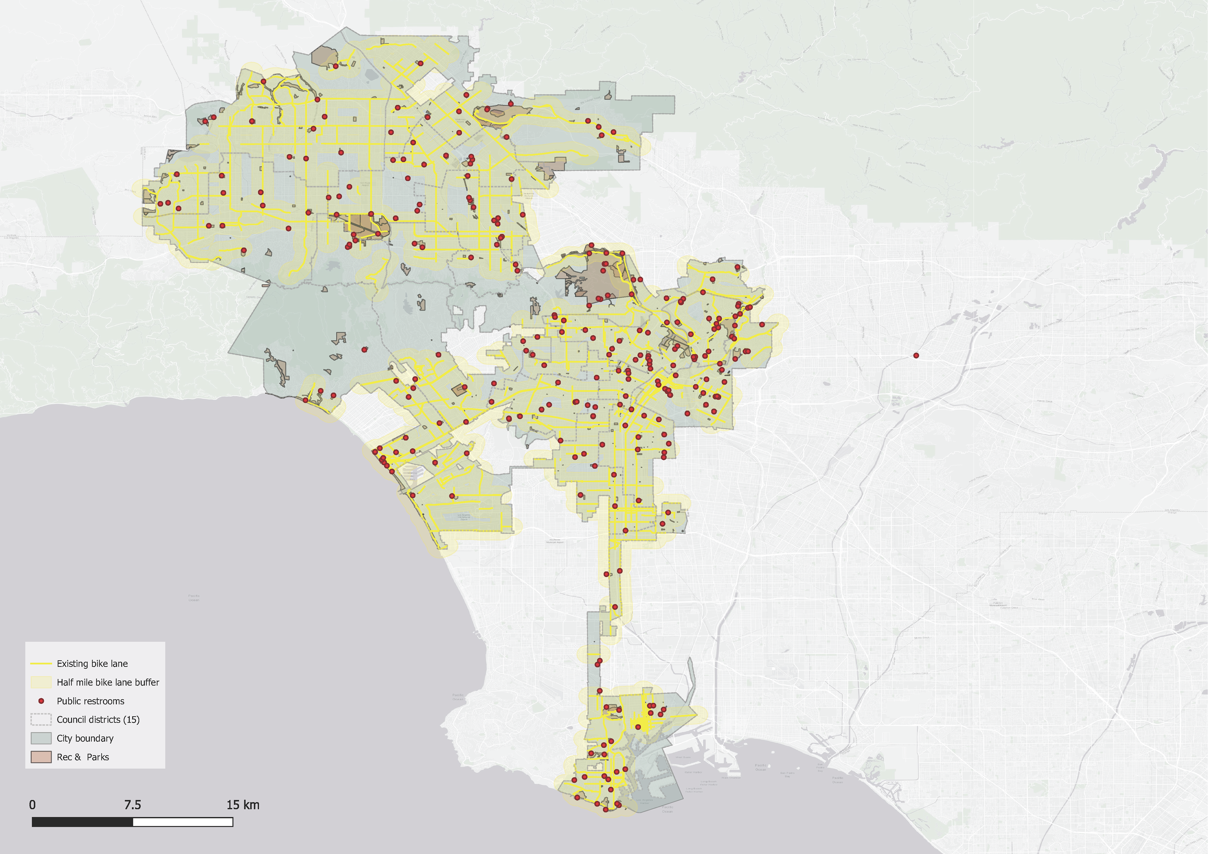 The city of Los Angeles talks a lot about improving the walkability of the city by improving subway lines and bikeways, but has yet to touch on the topic of improving accessibility to public restrooms a crucial factor. In mapping the public restrooms in QGIS with different modes of public and private transportation I examined which restrooms were most conveniently located. I cleaned up data received from each agency and created csv files to be used in QGIS to ease the workflow.