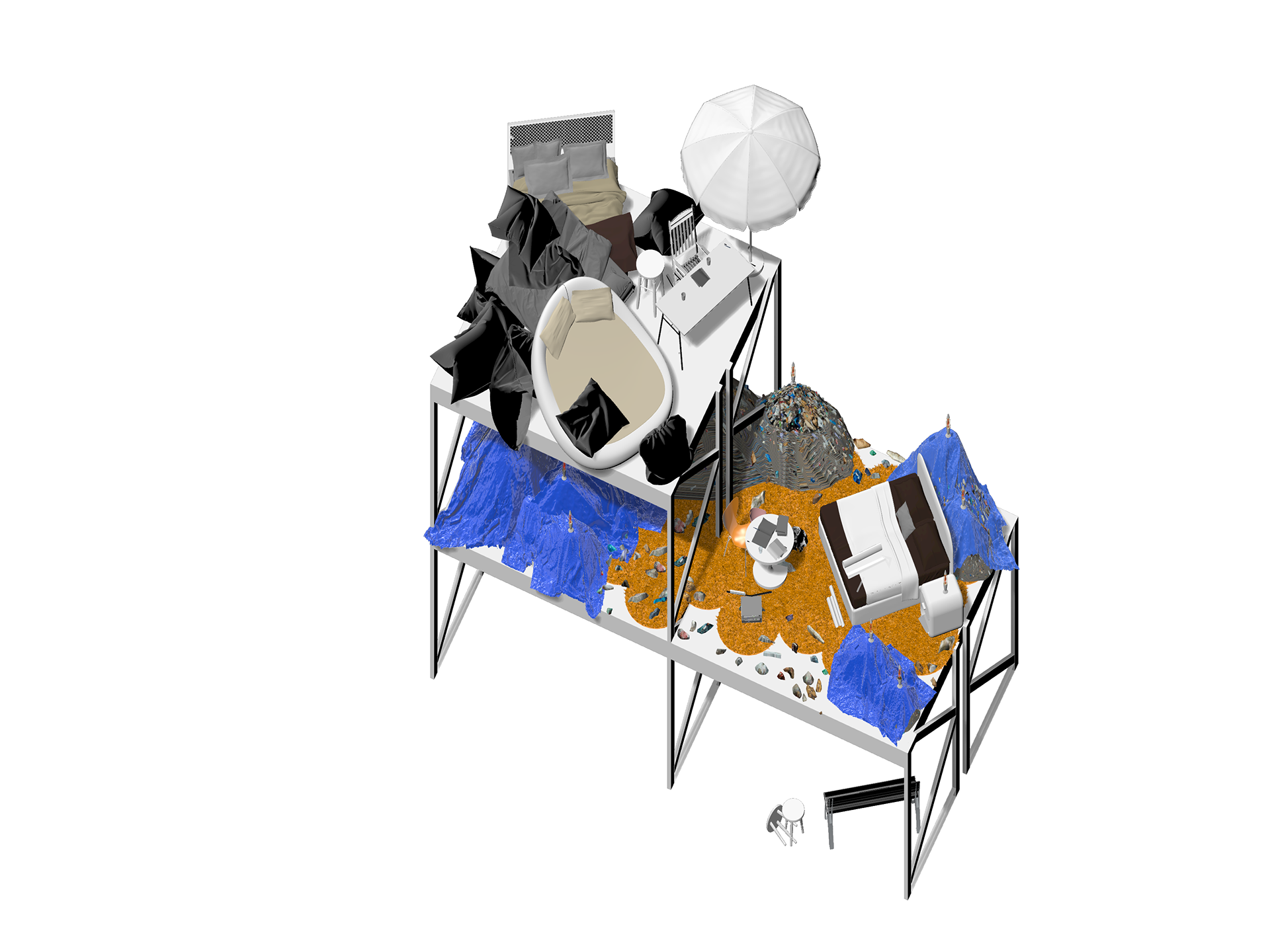 For this project, my teammates (John Li and Yikai Su) and I chose to highlight moments of the history of furniture that includes the “high end”, knock offs, consumerism, and the weird phases in a junkyard gallery/ museum/ flea market/ meet swap like space. For this project we were challenged to create a drawing purely out of ready-made 3D objects we found on websites such as Turbosquid.